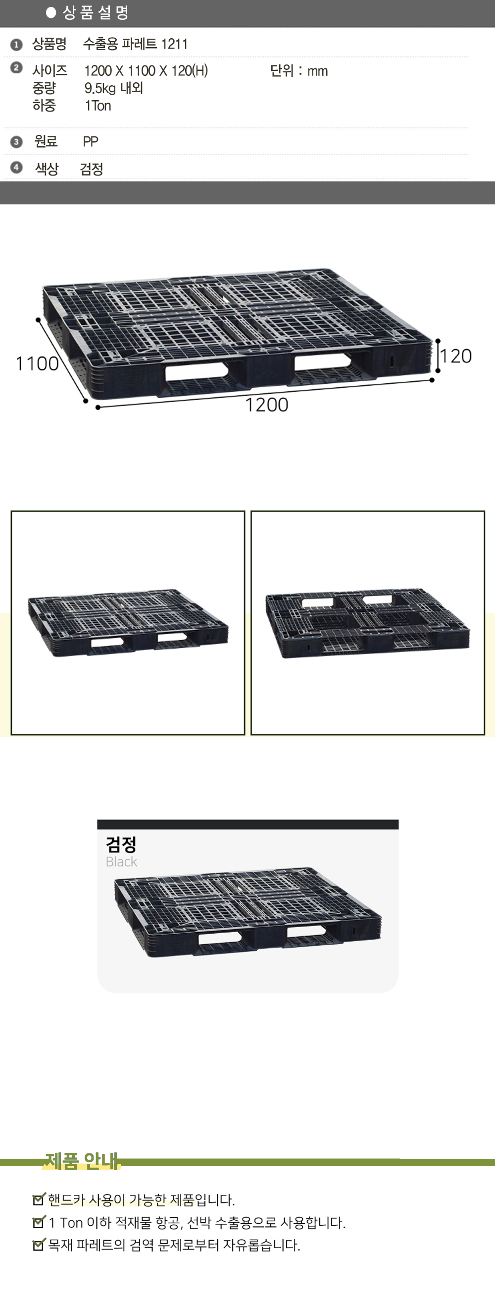 수출용 파레트 1211 검정1200x1100x120mm 1톤용 산업용 수출용 운반 파레트 플라스틱 파레트 마트 창고용